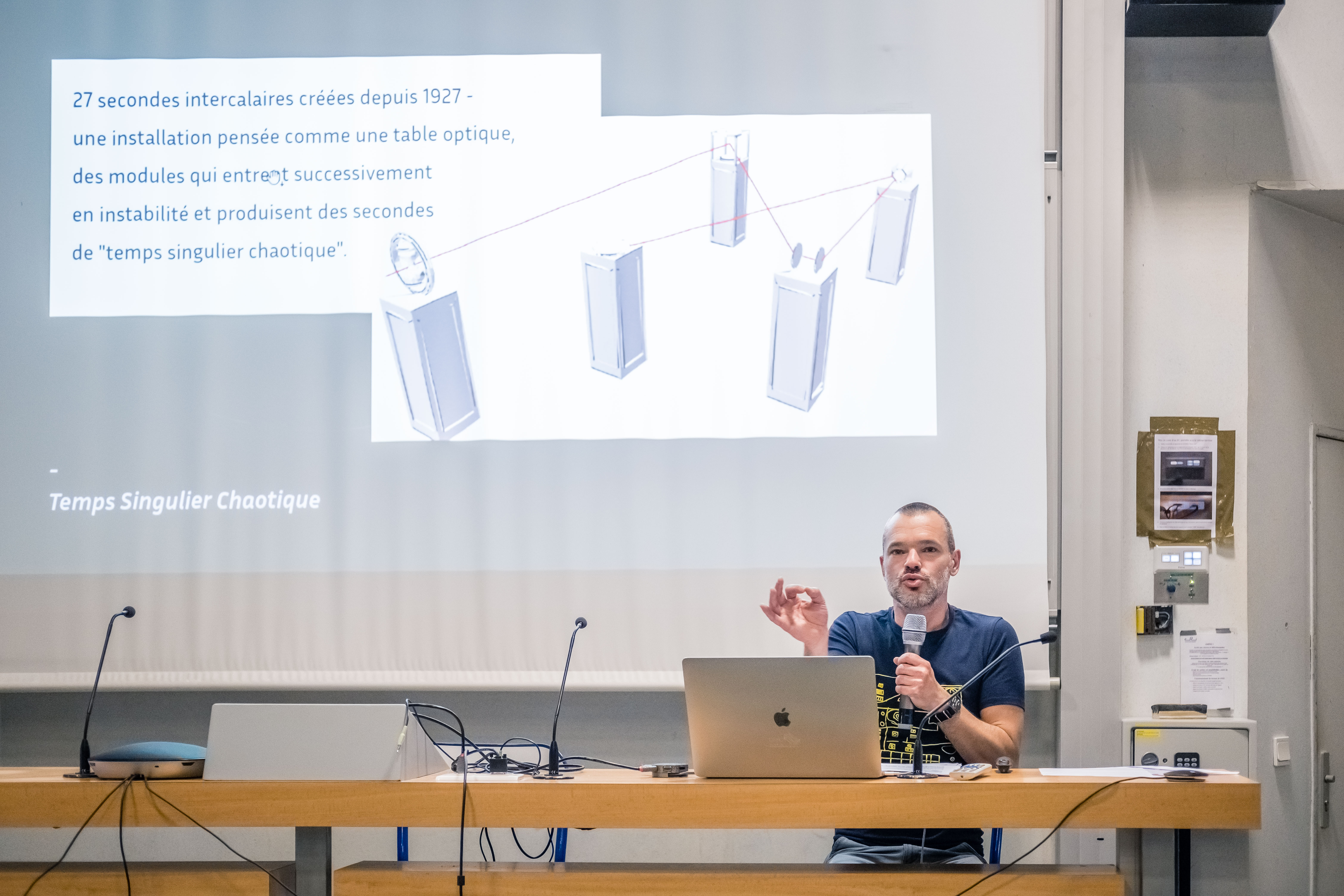- J'ai donc décidé d'élargir le champ, de comprendre pourquoi mesurer le temps est important, et comment trouver un élément qui pourrait faire entrer les non-scientifiques dans cette histoire. Je suis tombé sur cette histoire dont je n'avais jamais entendu parler de secondes intercalaires, qu'un comité décide, de temps à autre, d'ajouter ou de soustraire. 27 secondes dont la nature "humaine" apparaît de manière plus flagrante que les autres. Et qui permettent de mettre en lumière le fait que mesurer le temps, c'est avant tout comparer des variables physiques, des phénomènes cycliques. C'est ce rapport intriqué entre ce qui est une convention sociale humaine partagée, des phénomènes physiques immuables (l'oscillation du césium, mais aussi à une toute autre échelle les mouvements astronomiques), qui m'a amené à proposer que ce projet créé des secondes, des secondes propres à chaque spectateur de l'oeuvre, des secondes de temps artistiques.